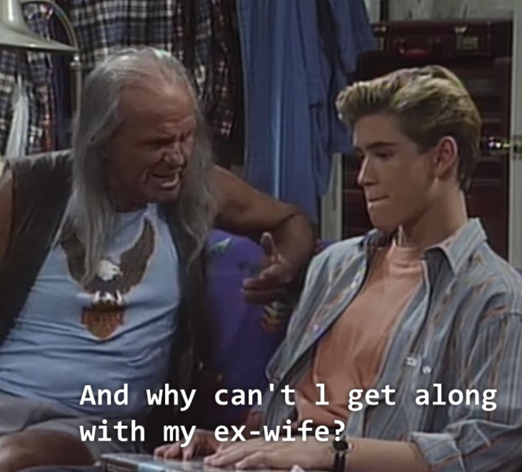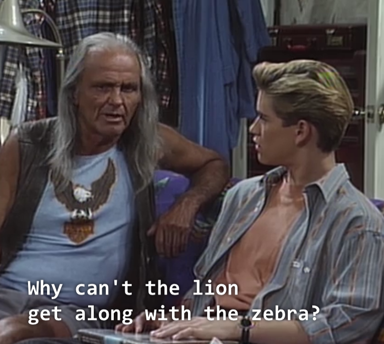 Zack finally gets his A when he comes to class in full stereotypical Native American garb. Poor Mark-Paul Gosselaar. What sixteen year old wants to dress up as a stereotype of a culture to which he has no actual relation? And as a job requirement? The worst part of all of this is that I truly feel like Saved by the Bell‘s heart was in the right place. They set Zack up with this whole it’s bad to stereotype, it’s important to know where you come from, and we need to respect other cultures plot-line. But then the writers/producers/tween Saturday morning audience either had or expected so little actual knowledge of history and culture that this episode ends up confronting one cliche with another cliche.