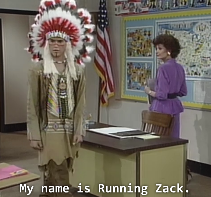 Luckily, his teacher calls him out on being a total jerk. He obviously knows nothing about history—he says his family is Cherokee from Burbank—so perhaps she should also be pissed at her own lack of efficacy. His teacher conveniently knows a chief, who educates Zack on his ancestors. On their second meeting he greets him as “Running Zack.” He says, “You run, you’re Zack, it works.” Then he offers this valuable lesson in cliches and offensive statements about why the “Indians” and the “white man” have such a gruesome history: