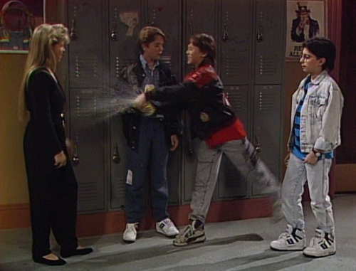 Meanwhile, DJ has gotten Kimmy’s mom (Kimmy has parents who are actually involved in her life at this point) to drive her back to school so she can get Kevin to explain to her father what really happened. For some reason, Jesse and Danny need only this twelve-year old child–a relative stranger to them–to corroborate DJ’s story in order for them to believe her. Ugh. So then Jesse is all like sorry DJ, I just know that alcohol has really messed up some of my friends and I totally took that out on you because I love you so much. And DJ is all like yay you trust me again and you were just worried!