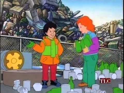 Luckily, Murph is there to show them how to recycle bottles and cans (at the landfill that used to be their school) in order to rebuild their bus from plastic pellets in a few short minutes! Idk if this is okay with child labor laws, but I guess they were in dire straights and really needed that bus back. Now that they have the bus back, Ms. Frizzle restores the recycled world!