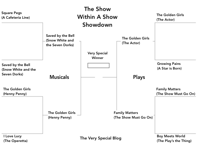 Welcome to our first matchup of the Show Within A Show Showdown! Today, Square Peg‘s original musical “A Cafeteria Line” faces off with Saved by the Bell‘s rap-operetta, fractured-fairy tale “Snow White and the Seven Dorks.”