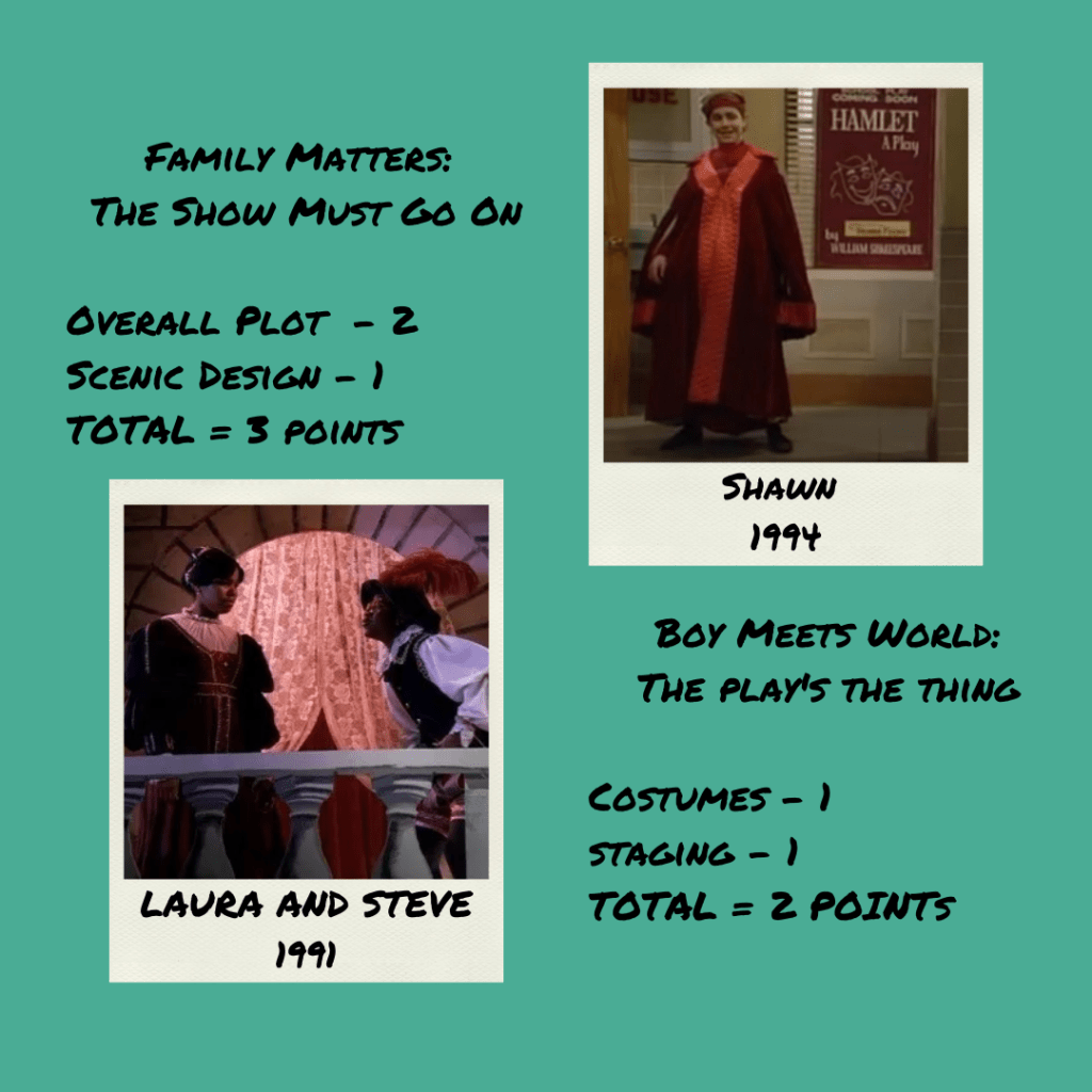 While I would argue that Hamlet has a better plot than Romeo and Juliet, I’m grading on what we actually see of the production in each of these sitcoms. And based on that alone, FamilyMatters is the clear winner. (If we were judging on episode plot it would be all about Boy Meets World though. Cory squanders the lead in Hamlet because he doesn’t want to wear tights and it’s all a very good insight into gender roles and insecurities whereas FM is about Laura and Steve kissing as the leads in R&J).