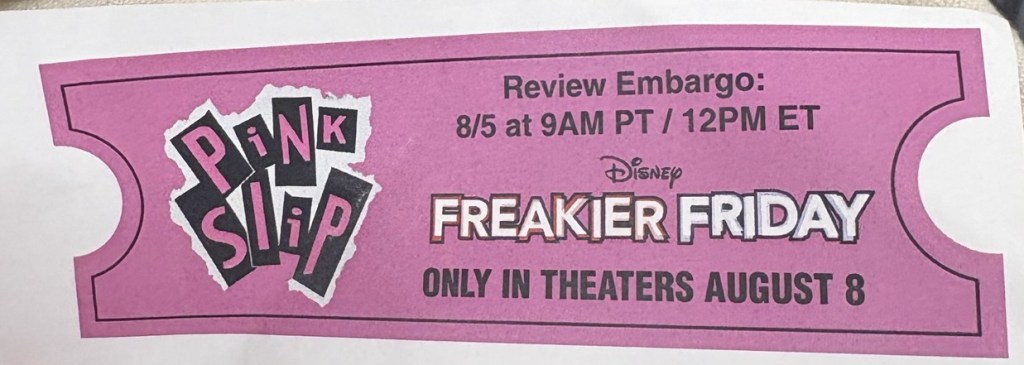Well, well, we’ll look who scored a ticket to a press screening of Freakier Friday! This little blog through no affiliation with the actual blog at all! Which is to say, yes, I found myself at an embargoed screening of a major motion picture release. And yes, I decided I must find a way to participate in the fun of it, bringing me back here after so many months away. Although, I do feel a little bit like the crewman in the lifeboat at the end of Titanic.