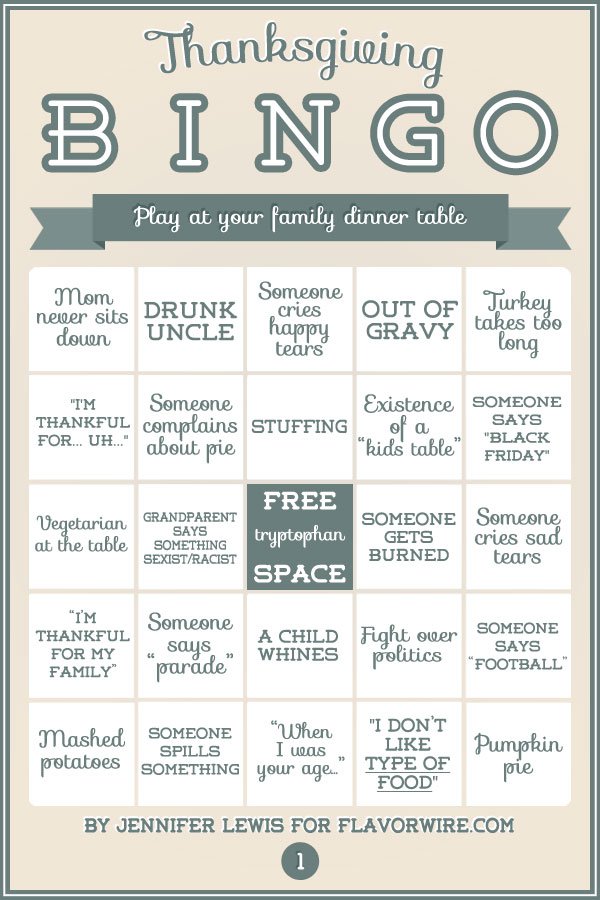 Very Special Thanksgiving Activity: Don’t forget to have a little fun this Thanksgiving. In my opinion, everyone should play a game. If you don’t have any standard family games, try this Thanksgiving Bingo that Jennifer Lewis at Flavorwire made a couple of years ago. But I suggest using this idea to make your own Bingo boards, so that you can make sure all of your familial quirks are represented.