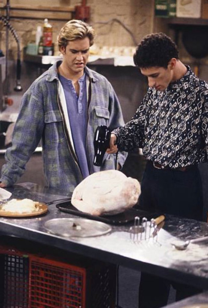 So the kids show up to eat while the turkeys are still frozen. Zack runs off to find an open store while Screech tries to thaw the turkeys with a hair dryer. (I am sure this is not a best practice for food safety.)