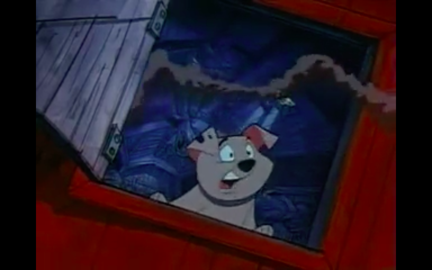 Faced with a literal hellscape, the dogs decide to help Cruella with her smoking cessation plan if only so they can sleep a little better at night (a.k.a. without the constant threat of death). They spend a lot of time snatching cigarettes out of Cruella’s mouth and blowing out her matches. After realizing that this is a Sisyphean approach, they decide to lock her in the bathroom while they destroy her stash.
