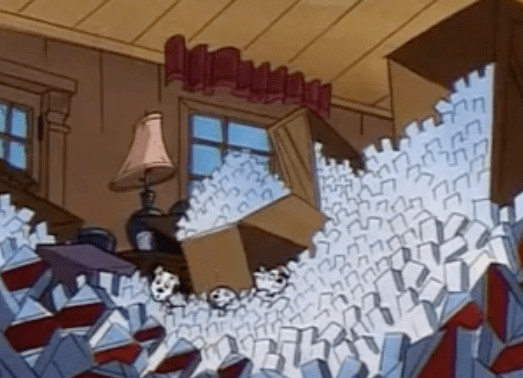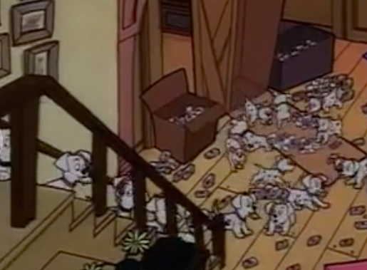 While Cruella is dazed and locked in the downstairs bathroom, these puppies create a literal assembly line to move several thousand boxes of cigarettes to the upstairs bathroom where they intend to flush them down the toilet. At this point, I have to ask where even are Pongo and Perdita?? It seems like these puppies could use some adult supervision!