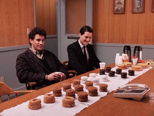 It’s national donut day! The best day of the year! Today I seriously considered that maybe I had made a mistake by not being a patrol officer. But then I remembered all the things that police(wo)men have to do and it didn’t seem like such a good fit for me anymore. So now I’m thinking that my ideas job is working at the Twin Peaks sheriff’s office. Preferably, I would work in a job like Lucy’s. I’m sure Lucy was responsible for setting up this lovely spread: