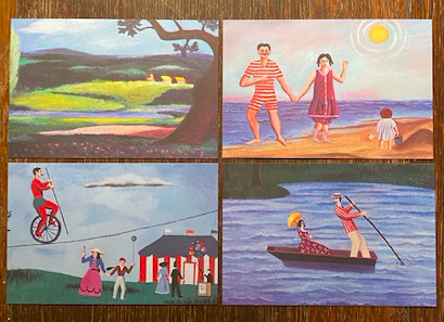 Their most recent line is inspired by Mary Poppins. And while titular character’s set was gorgeous but not quite my speed, I jumped right on the Mrs. Banks nail polish and lipstick duo. Not only because lipstick is the one makeup item that I do semi-regularly wear, but also because this set includes these lovely postcards inspired by Bert’s chalk drawings from the film.